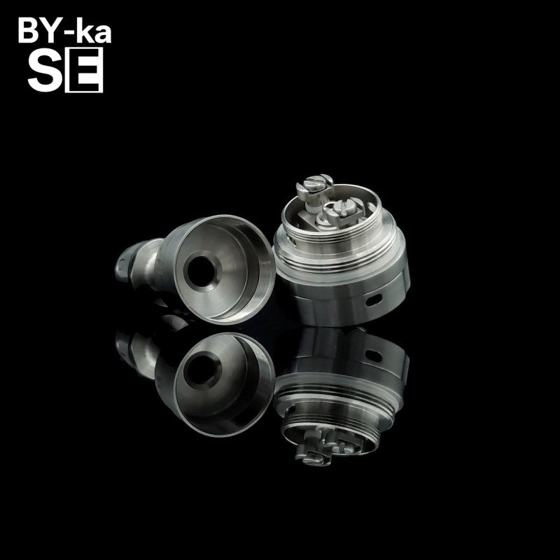 L’estetica del BY-KA SE è un perfetto connubio tra il classico look sovietico dei vecchi BY-KA e la ricercatezza del V.9. Viene migliorata da una nuova campana con lavorazione conica che va a restringe il diametro esterno alla sommità per congiungersi alla perfezione con il nuovo Drip Tip in policarbonato lucido.
